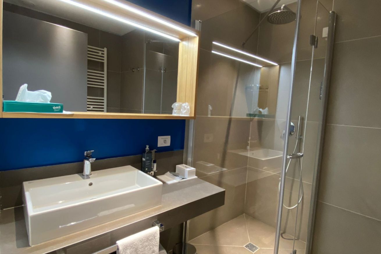 Dispone di: finestra, climatizzatore, WiFi gratuito, presa USB, bollitore con una selezione di caffè e tè, frigobar, Smart TV schermo piatto 43”, SKY vision gold, bagno privato, asciugacapelli, linea cortesia, scalda asciugamani.